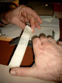 3) slice the white center lengthwise into 1/16" (1 - 2 mm) thin strips. Every sheet of papyrus will require about 30 strips. Each papyrus stalk should yield about 10 strips